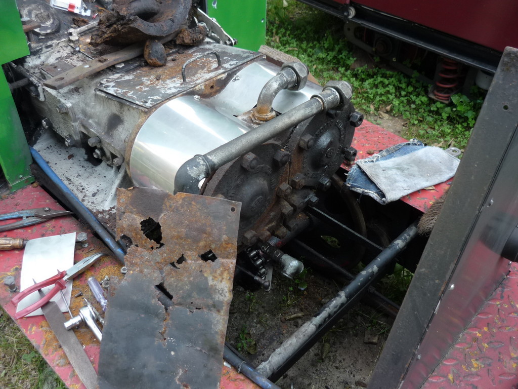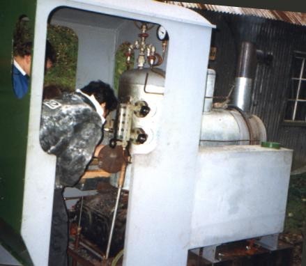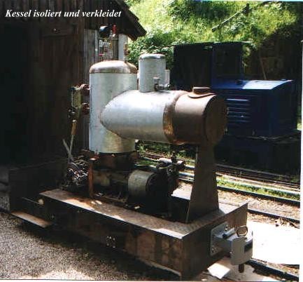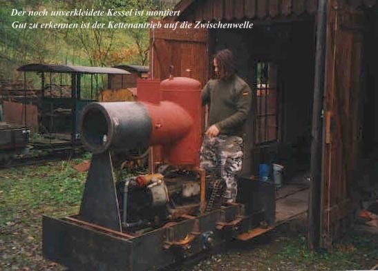 Mir kam mir zugute, daß Feldbahnfreund Andreas Scholz in etwa die gleiche Idee hatte und bereits eine Kleinlok gebaut hatte (FEBA), die in Serie gehen sollte. Eine komplette Lok war für mich unerschwinglich, wohl aber ein Kessel(chen) dieser Kleinserie. Mein Freund Bernard Bommert aus Le Mans, der sich aus einer Lore, einem Dampfkessel eines Bügelsalons und einem Stokermotor aus einer 141R eine "Trambahnlok" nach dem Vorbild der Tramways de la Sarthe gebaut hatte, hatte mir im Tausch gegen einen Deutz Verdampfermotor eine solche 2-Zylinder Hilfsdampfmaschine überlassen.